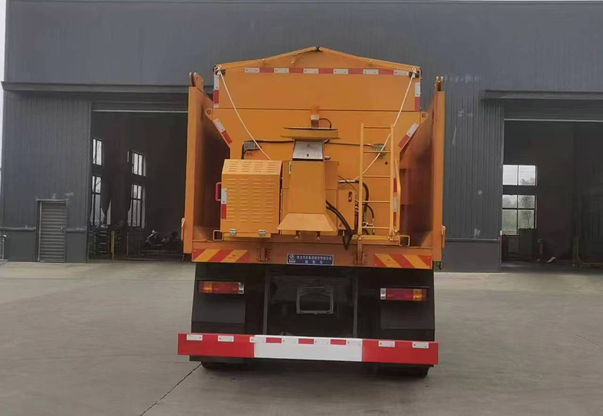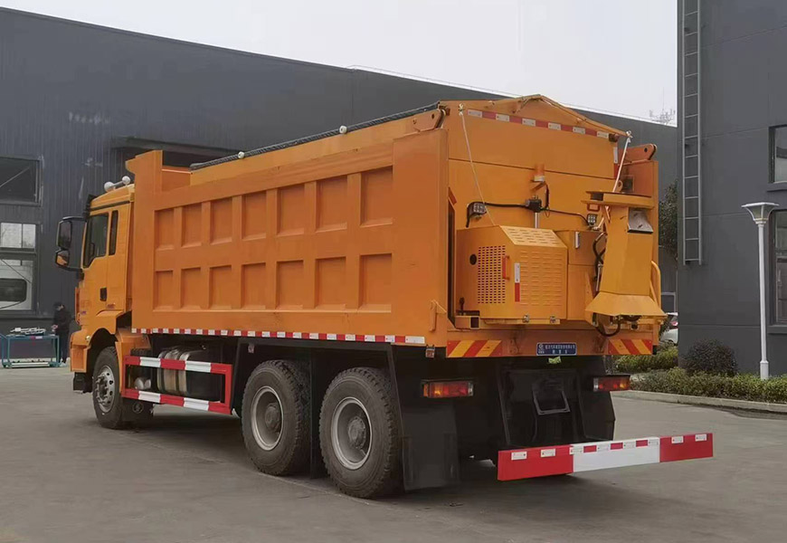 上裝配置 箱體采用優(yōu)質(zhì)碳鋼板,標(biāo)配10立方撒布機(jī)也可以選裝12立方,不銹鋼撒布機(jī)甩盤,撒布盤直徑550mm,撒布機(jī)采用 V 型料倉,結(jié)構(gòu)簡單可靠,使融雪劑自動(dòng)落料,出料完全,無殘留,箭頭燈、篷布、過濾網(wǎng)、后爬梯。加裝3.5米雪鏟,可切換3.5米除雪滾刷(滾刷可選自帶動(dòng)力或者液壓取力)。