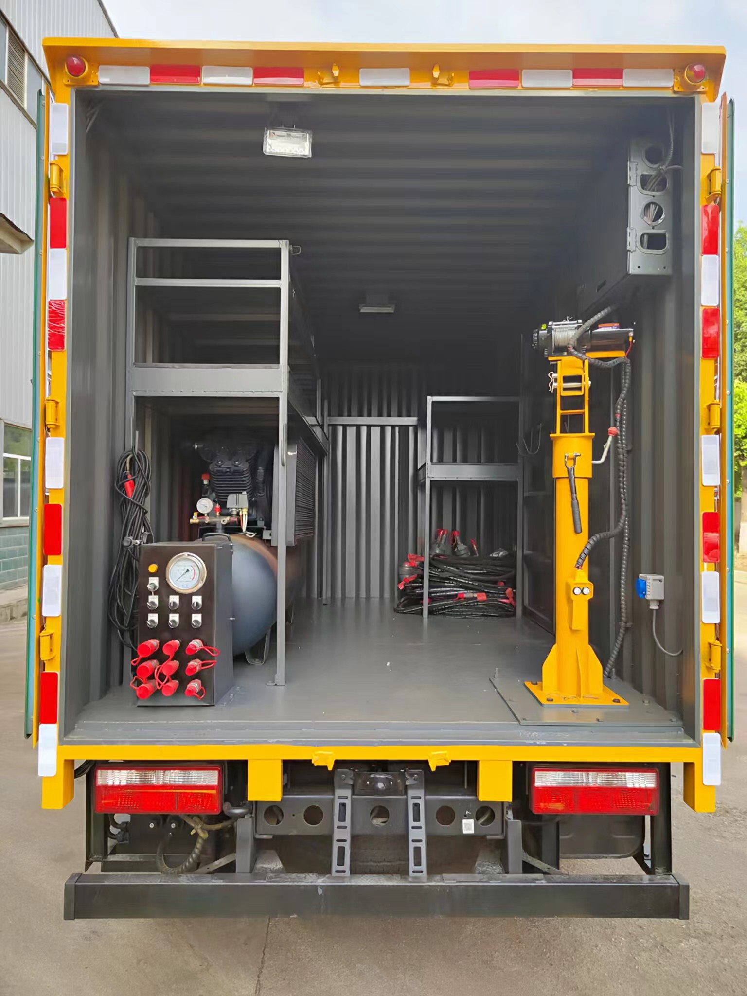 上裝配置  箱體采用瓦楞箱體,側(cè)面和后面各一個(gè)雙開門,箱內(nèi)設(shè)計(jì)兩個(gè)貨架,箱內(nèi)設(shè)計(jì)照明燈,安裝液壓動(dòng)力系統(tǒng),三套液壓動(dòng)力取力快速接口,帶控制面板兩臺4寸的渣漿泵,帶水帶和液壓管(帶快接)裝一個(gè)液壓驅(qū)動(dòng)空壓機(jī),一個(gè)800公斤12V電控小吊機(jī)安裝3500W逆變器,帶電控箱,其他程力專用車廠家標(biāo)配…