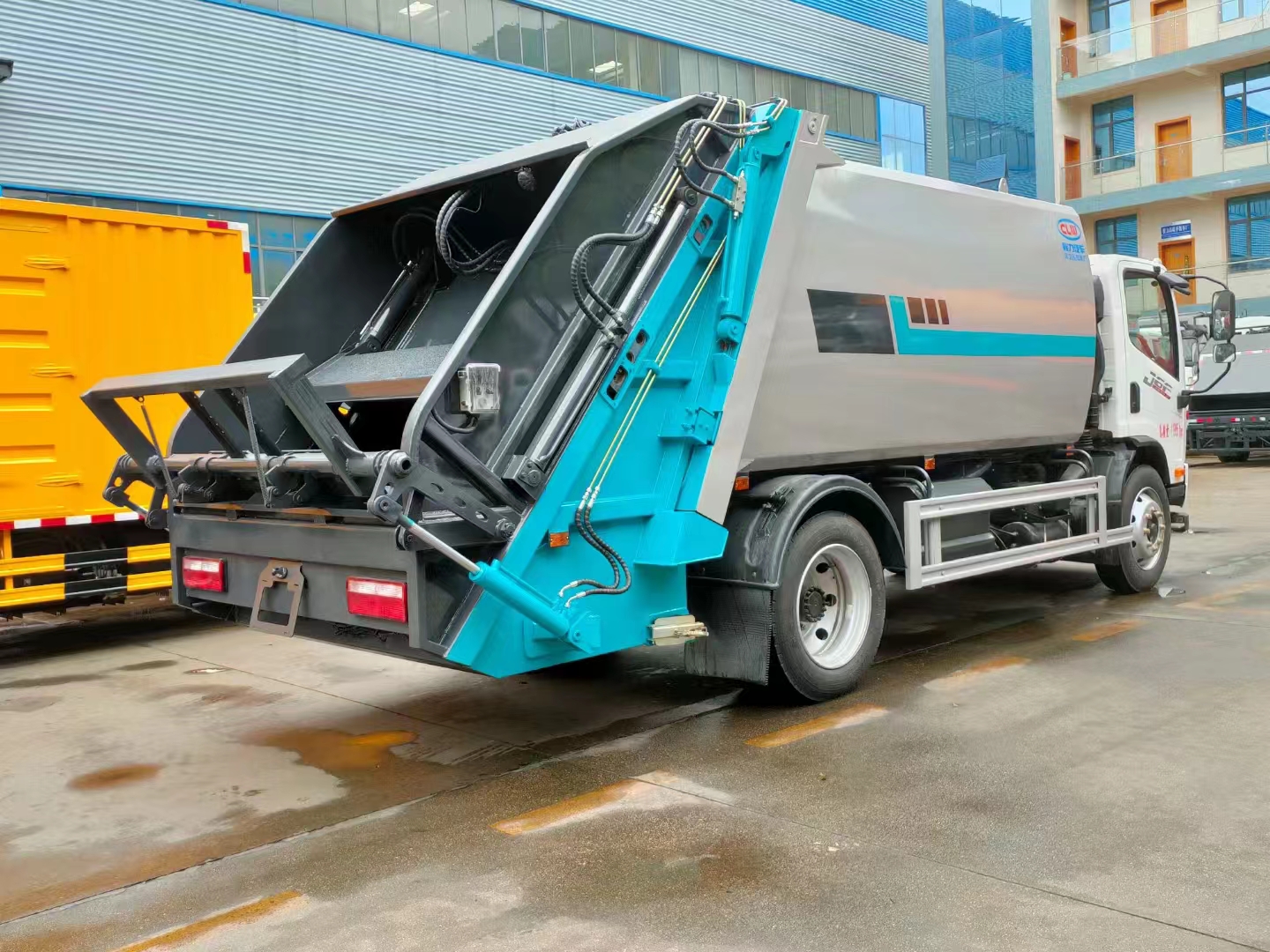 | 上裝配置 | 箱體容積11立方,采用邊四底四高強(qiáng)板制作,機(jī)器人自動(dòng)焊,電泳工藝涂裝,威森博樂多路閥,皖液油泵,填裝器外置滑板油缸結(jié)構(gòu),尾部翻轉(zhuǎn)結(jié)構(gòu)可掛120/240L垃圾桶。 | ||