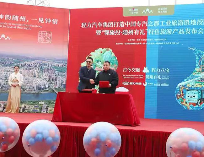 在程力工業(yè)旅游產(chǎn)品發(fā)布會(huì)上,程力汽車集團(tuán)總經(jīng)理程阿羅(左)與鄂旅投總經(jīng)理王濤,簽署了文化旅游戰(zhàn)略合作框架協(xié)議,雙方?jīng)Q定利用各自的優(yōu)勢(shì)強(qiáng)強(qiáng)聯(lián)合,共同開發(fā)工業(yè)旅游潛在市場(chǎng),為隨州的經(jīng)濟(jì)發(fā)展增添新的動(dòng)能。